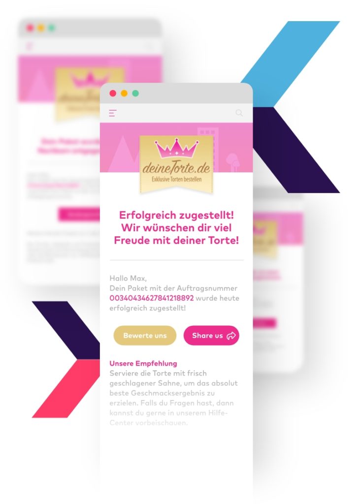 deineTorte.de hat 16 verschiedene Status-Trigger aktiviert, die – sollte es auf der Paketreise zu dem entsprechenden Ereignis kommen – automatisiert Updates an die Kunden verschicken. Alle Versand-E-Mails haben das klare Ziel, dass die Torten und Gebäcke rechtzeitig und frisch beim Kunden ankommen.