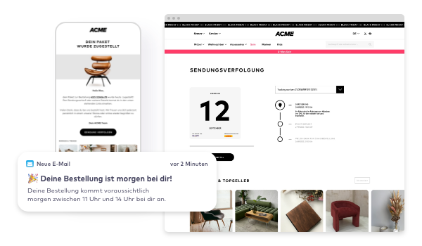 Mit unserer Versandkommunikation versorgst du deine Kunden mit detaillierten Lieferstatus-Updates, im Look & Feel deiner Brand. Mit vollständiger Transparenz sorgst du für ein reibungsloses Einkaufserlebnis, reduziert effektiv Rückfragen zum Versandprozess und erhöhst die Kundenbindung.